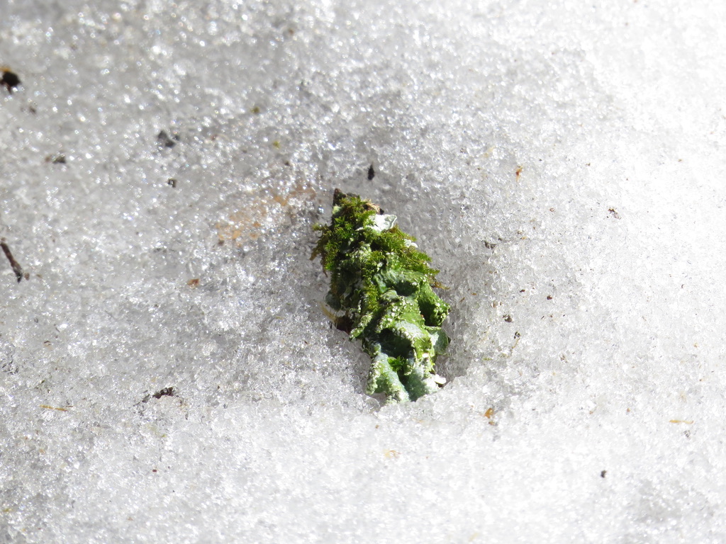 Most hikes, I am looking up, scanning for birds or other unidentified tiny fliers, but if the snow is deep underfoot, my eyes tend toward the ground directly ahead. I’m not as steady as I used to be and find each year brings less willingness to fall; more caution and dependence upon, not one, but two sturdy walking poles. What lies beneath could twist an ankle or cause a slip, maybe a slide, so I look down, and before I know it, am distracted by the beauty at my feet and thoughts of personal calamity fade – for little while.